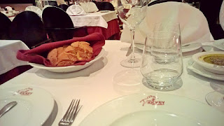 Após nos sentarmos na nossa mesa, foi-nos servido o couvert e apresentada a ementa. Ambos escolhemos a bruscheta de camarão como entrada, tendo depois divergido em termos de pratos principais, eu pedi os bifinhos de veado com molho de três pimentas e a minha companhia costeletas de vitela mertolenga ao maitre D'Hotel.