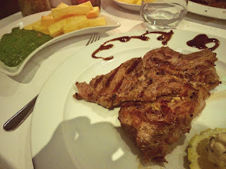 Ao fim de algum tempo vieram então os pratos principais. Muito bem servidos em termos de carne, sendo acompanhados por batata frita e esparregado. A carne estava muito bem temperada, macia, sem oferecer qualquer resistência à faca que calmamente a ia separando do seu todo. Nunca tinha experimentado carne de veado, não é má mas não achei que tivesse um sabor que a distinguisse de forma preponderante de outras carnes vermelhas. O molho de três pimentas estava ótimo, tanto que não resisti em molhar o pão no molho (sim, a problemática das calças de ganga já estava para trás das costas, já tinha voltado a ser eu próprio, alguém sem grande respeito pela etiqueta).