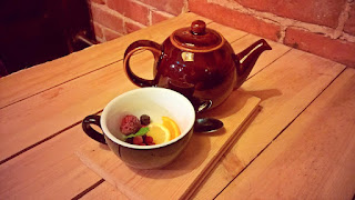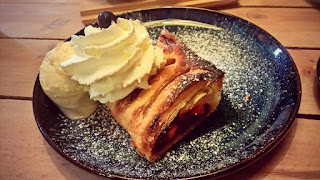 Para acompanhar, existe pastelaria variada, sandwiches e saladas. Nós ficámo-nos por um croissant com fiambre e uma fatia de strudel com frutos silvestres, bola de gelado e chantilly. Tudo estava muito bom, mas estávamos tão confortáveis, tão embeiçados pelo espaço que se nos tivessem servido pedras da calçada teríamos achado que estava excelente :-) Pronto estou a exagerar mas o espaço é realmente interessante e diferente do que tem surgido em Lisboa nos últimos tempos, e que eu tenha tido oportunidade de visitar.