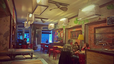 E por falar no espaço interior, não sei muito bem como o descrever. É um mistura de vários materiais, como madeira (muita madeira), metal e tijolo, e elementos decorativos que no fim criam um ambiente heterogéneo, que tem tanto de antigo como de moderno. Senti que tanto poderia estar nas traseiras da avenida da Liberdade como numa Estalagem no meio dos Alpes Suíços ou na Minnie's Haberdashery com o Samuel Jackson sentado a um canto.
