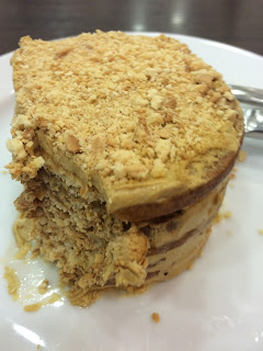 Numa derradeira tentativa de descobrir as afamadas maravilhas da Sacolinha provei o bolo de bolacha. Como sou uma grande fã deste tipo de bolo, a prova era importante. Que desilusão! Dava para trincar o açúcar, como é possível?!?